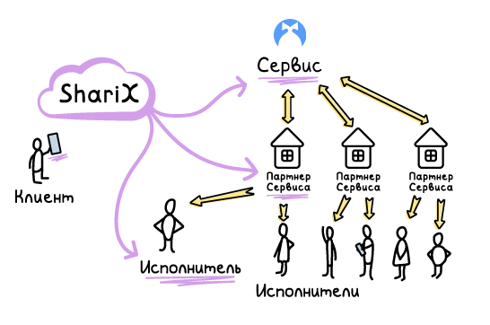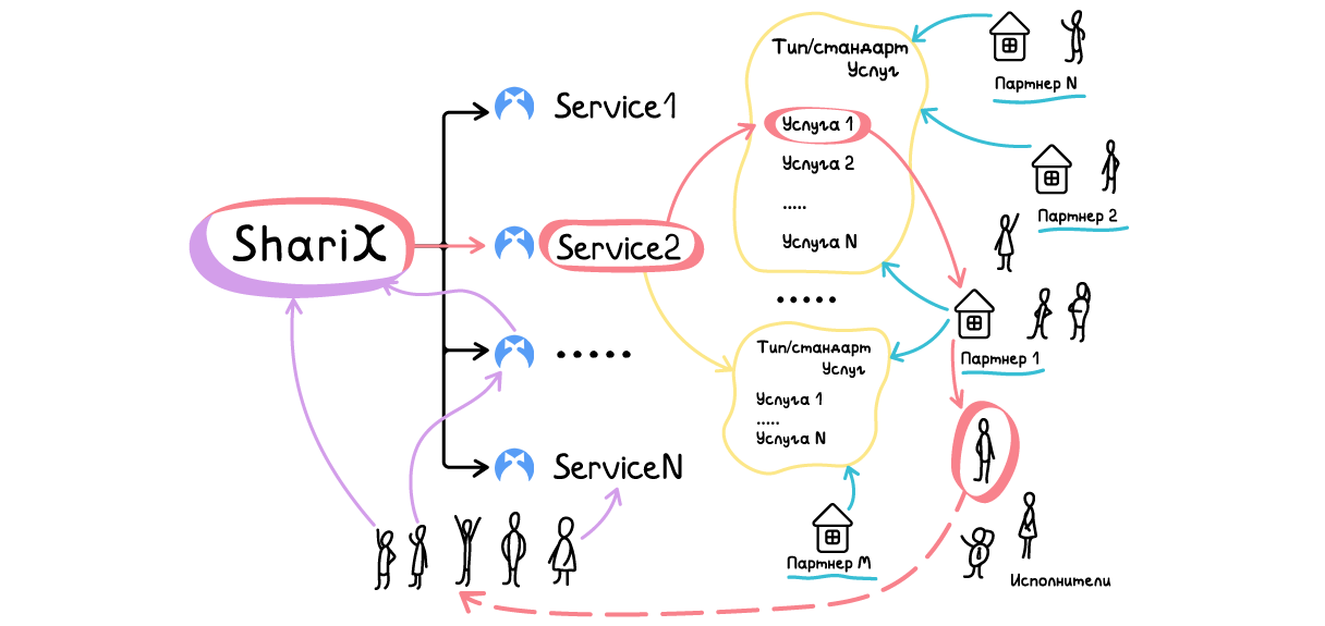 Платформа ShariX работает со множеством дочерних сервисов. Она обрабатывает пользовательские данные в соответствии с запросами дочерних сервисов и подбирает оптимальное решение, а также проверяет действительность взаимоотношений между всеми участниками услуги и производит взаиморасчеты.